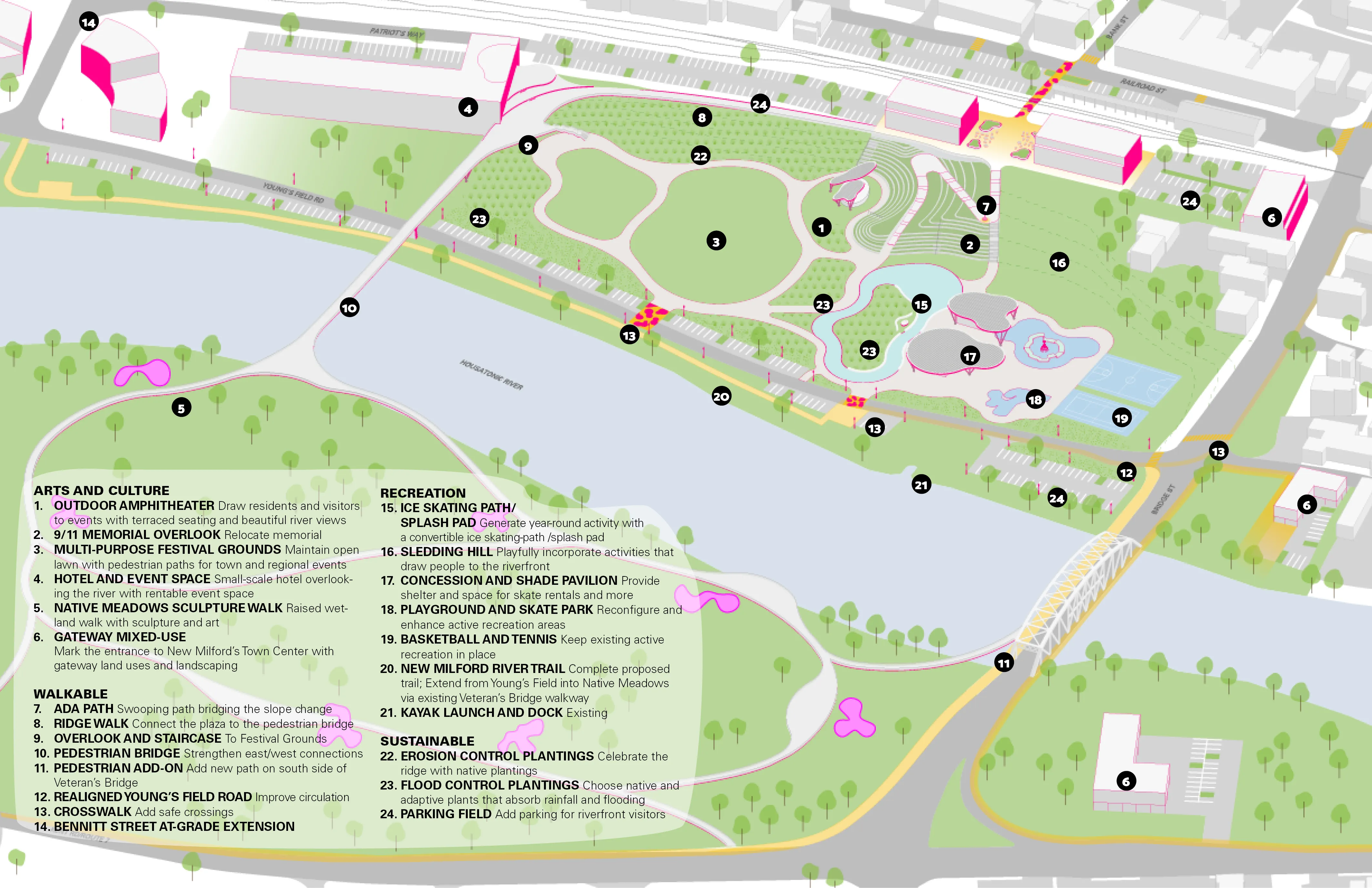 The New Milford Riverfront Revitilization is a community-driven effort to create a dynamic, 21st-century riverfront integrated with New Milford's Town Center. The vision is to catalyze community development, resiliency, and revenue generation for the town, while protecting the Housatonic River and its ecosystem.