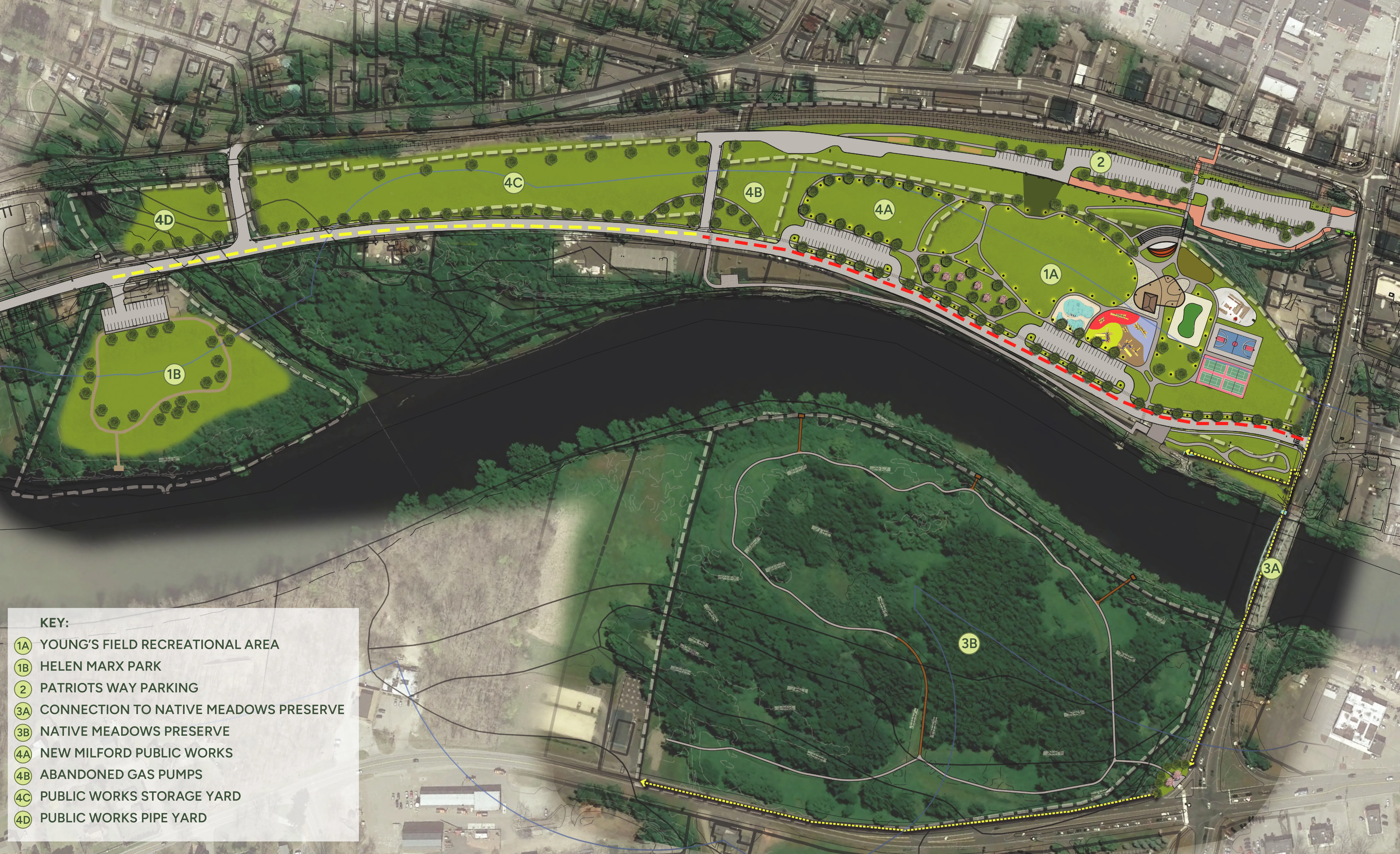 The plan was contingent on relocating the softball fields to another location. It included a pedestrian bridge over the Housatonic to connect the east and west banks and the Young’s Field and Native Meadows areas. It also contemplated multi-use development within Patriot’s Way.